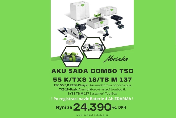 Co by měl mít člověk vždy s sebou? Výkonnou akumulátorovou ponornou pilu a silný akušroubovák s vhodným ToolBoxem v sadě akumulátorového nářadí. Se sílou hned dvou 18V akumulátorů a bezuhlíkovým motorem EC-TEC s dlouhou životností usnadňuje akumulátorová ponorná pila TSC 55 K řezání a zanoření. Integrovaná technika KickbackStop kromě toho zastaví pilový kotouč, když dojde ke zpětnému rázu. S touto pilou se podaří řezy nejen až dvakrát rychleji než s jiným nářadím, ale zároveň i bezpečněji pro vás i obrobek. Všude tam, kde je třeba vyvrtat otvory nebo zašroubovat šrouby, přichází ke slovu zase akušroubovák TXS 18. A díky rychlovýměnnému systému CENTROTEC a rozhraní FastFix lze nářadí rychle vybavit pro nejrůznější práce. Akumulátorové nářadí a ToolBox, který je zdarma součástí dodávky, jsou bezpečně uložené v praktickém Systaineru³, takže je můžete pohodlně přepravovat z dílny na další montáž. Mimořádná výhoda: jedinečná kompletní oprava (první tři roky zdarma) platí pro akumulátorové nářadí a dokonce i pro akumulátory a nabíječky (další informace na festool.cz/sluzby).