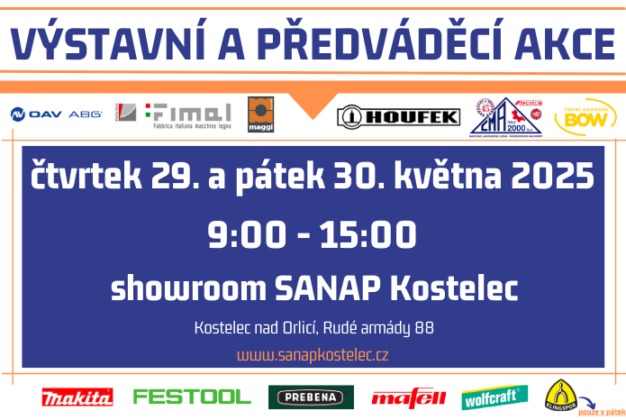 Před firmou, ale i uvnitř se Vám budou věnovat vyškolení technici značek FESTOOL, MAKITA, MAFELL, PREBENA, WOLFCRAFT a BOW. Předváděcí technik brusiva značky KLINGSPOR bude k dispozici POUZE V PÁTEK 30. května!