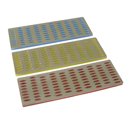 Barevně rozlišené diamantové kameny pro ostření nožů, dlát, fréz a malých ručních nástrojů. Balení obsahuje: standardní hrubost kamene (modrý) 180, středně hrubý (žlutý) 260 a jemný dokončovací (červený) 360. Možné použití za sucha nebo s malým množstvím vody pro mazání.