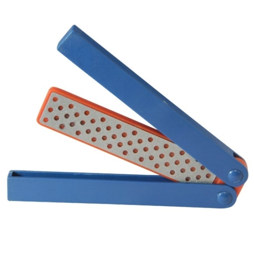 Skládací brousek s oboustraným diamantovým brusným kamenem pro ostření a honování dlát, fréz, hoblovacích nožů a ručního nářadí.