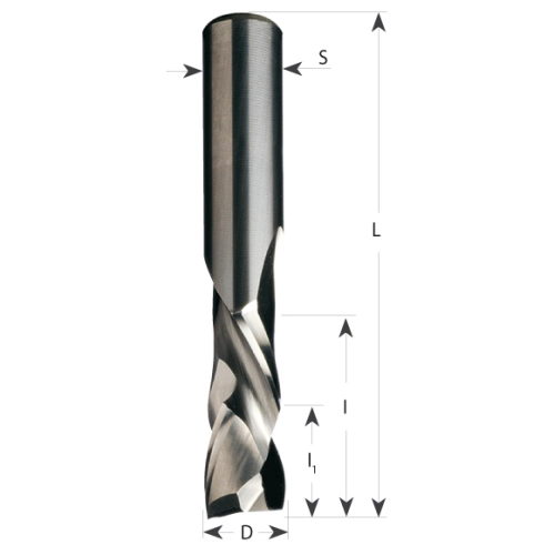Spirálová fréza má půlené ostří, v dolní části s pozitivním sklonem a v horní části s negativním sklonem. Tento typ ostření je ideální pro frézování všech materiálů. Výhodou je perfektní hrana řezu (bez otřepů) na dolní i horní straně desky. Určena pro použití na CNC obráběcích centrech i ručních horních frézkách.