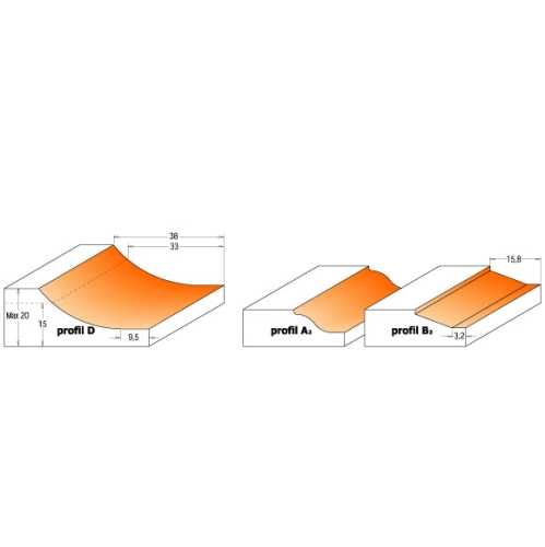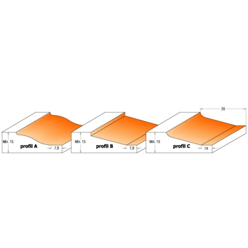 POZOR: Frézy používejte při nižších otáčkách mezi 10000 a 12000 ot./min. Pro bezpežné a přesné dosažení požadovaného profilu doporučujeme tři až pět průchodů. Výkon frézky musí být nejméně 1500W.