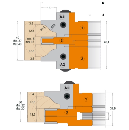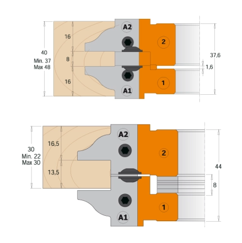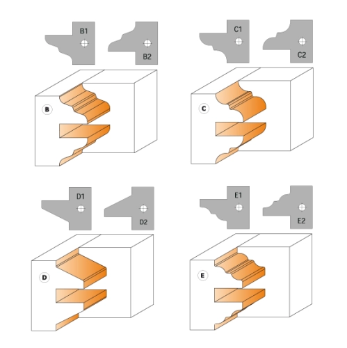Tento nástroj je určen k výrobě interiérových dveří z měkkého a tvrdého dřeva. Frézovací hlava je velice všestranná, neboť do ní lze upnout pět různých profilových žiletek, s nimiž vyrobíte nejžádanější profily. Stavitelnou drážkovací frézu, která je také součástí sestavy, lze použít samostatně k frézování drážek o tloušťce 8 až 15 mm. S touto jedinečnou CMT frézou vyrobíte profil rámu pro výplně i pro sklo. Určeno k použití se spodní frézkou. Výborně se hodí pro tvrdé a měkké dřevo o maximální tloušťce 48 mm.