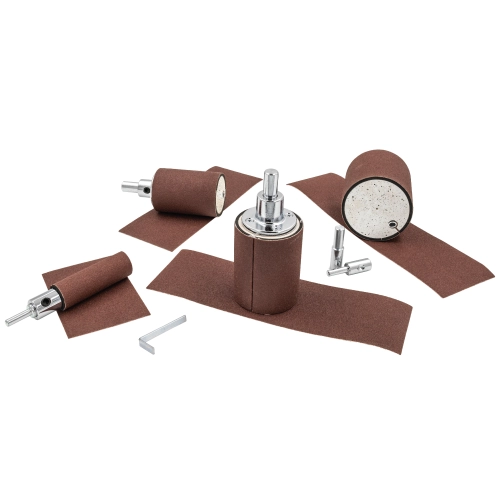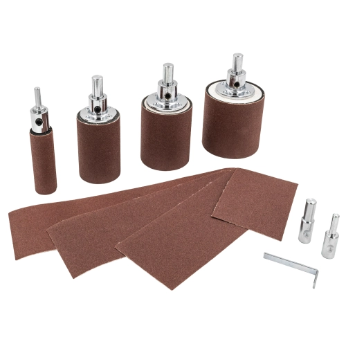 Sada 4 kusů brusných válečků je určena pro snadné a rychlé dosažení dokonale hladkých povrchů u všech zakřivených a kulatých dílců. Brusné válečky mají praktický upínací systém pro snadnou výměnu pásu. Doporučujeme použít pouze brusné plátno, u papíru může docházet k častějšímu roztržení. Na každý brusný váleček může být použit trn podle velikosti sklíčidla Vaší vrtačky. S brusnými válečky lze pracovat ve stojanové vrtačce. Menší průměry 25mm a 53mm můžete použít i v ruční vrtačce. Doporučené otáčky 1000 - 1500 ot./min dle průměru válečku a materiálu. Malý průměr -> vyšší otáčky, větší průměr -> nižší otáčky.