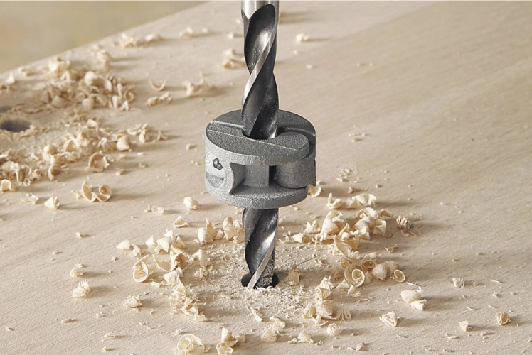 Pro výrobu hmoždinkových spojů, pro přesné značení otvorů pro kolíky, pro dřevo, překližky, dřevotřískové desky, konstrukční desky, vrták s přesně vybroušeným hrubovacím výstružníkem a středicím hrotem, nastavení hloubky vrtání pomocí hloubkového dorazu.