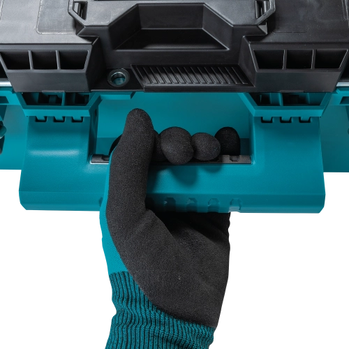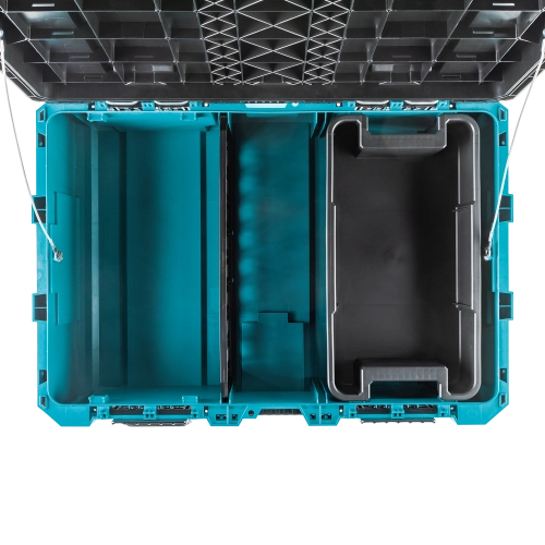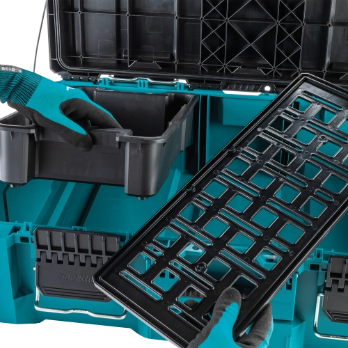 Box na nářadí je vyroben z kopolymeru odolného proti nárazu, aby vydržel nejnáročnější podmínky na pracovišti. Úložný zásobník je navržen jako řešení pro bezdrátové nabíjení s vyhrazeným prostorem pro nabíječku a baterii.