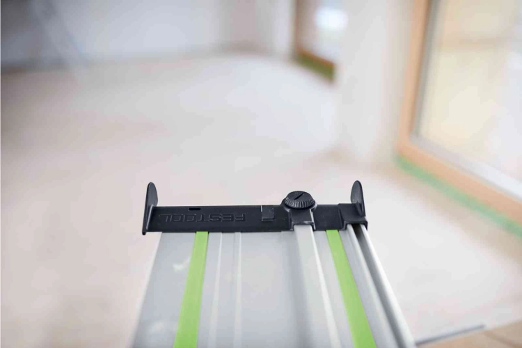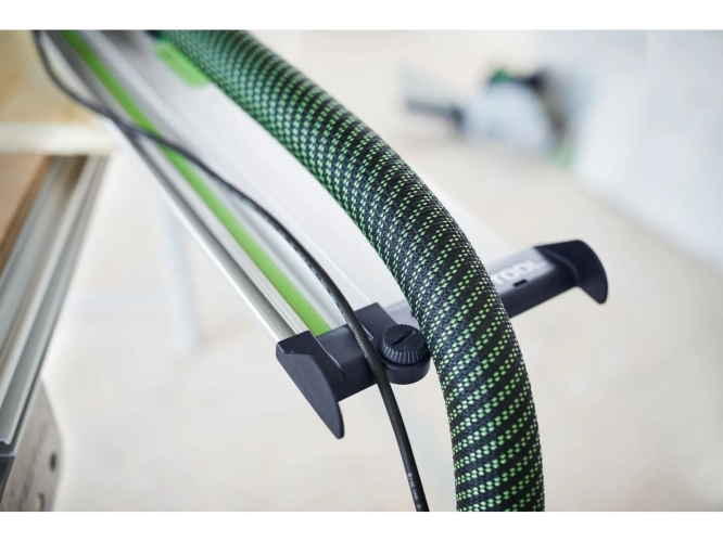 Usměrňovač vede kabel a sací hadici na konci vodicí lišty při řezání s ponornou pilou nebo okružní pilou bez zaháknutí.