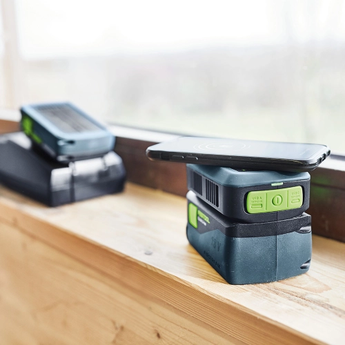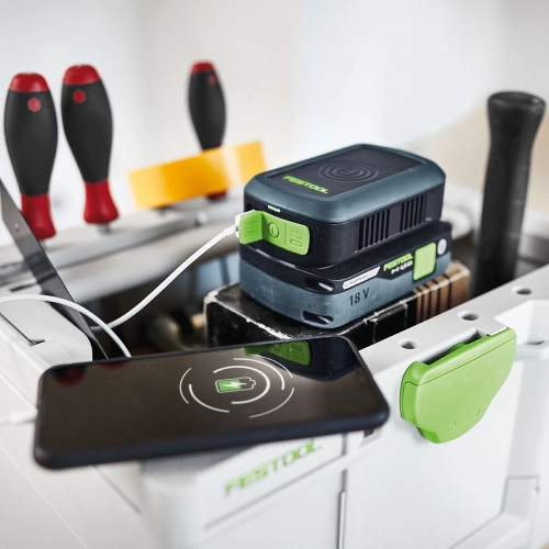 -Zajišťuje nezávislost: v kombinaci s nabitým 18V akumulátorem Festool nabíjí mobilní telefon i tehdy, když není v blízkosti zásuvka
