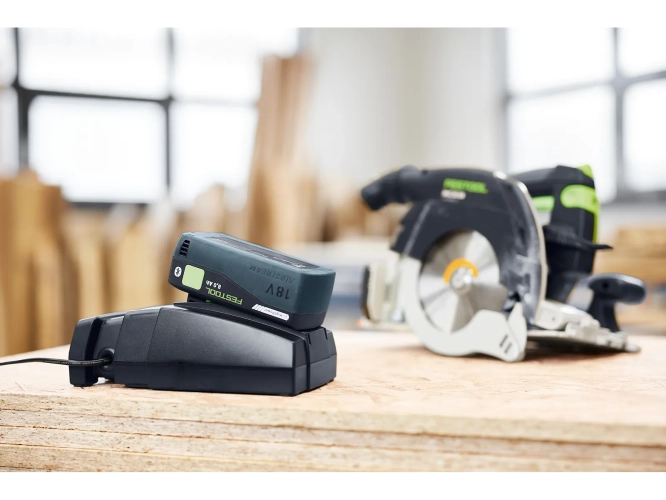 -Chytré rozšíření: aplikace Festool App umožňuje v kombinaci s funkcí Bluetooth® u akumulátoru chytré přídavné funkce, jako např. podrobné zobrazení stavu nabití a dalších provozních údajů, jako např. teploty nebo nabíjecích cyklů. Pro rychlou a jednoduchou identifikaci akumulátoru s nejnižším stavem nabití můžete nechat přímo na akumulátoru zablikat LED ukazatel. Lze také aktualizovat software: nainstaluje se nejaktuálnější verze, abyste vždy pracovali s nejnovějšími funkcemi nářadí