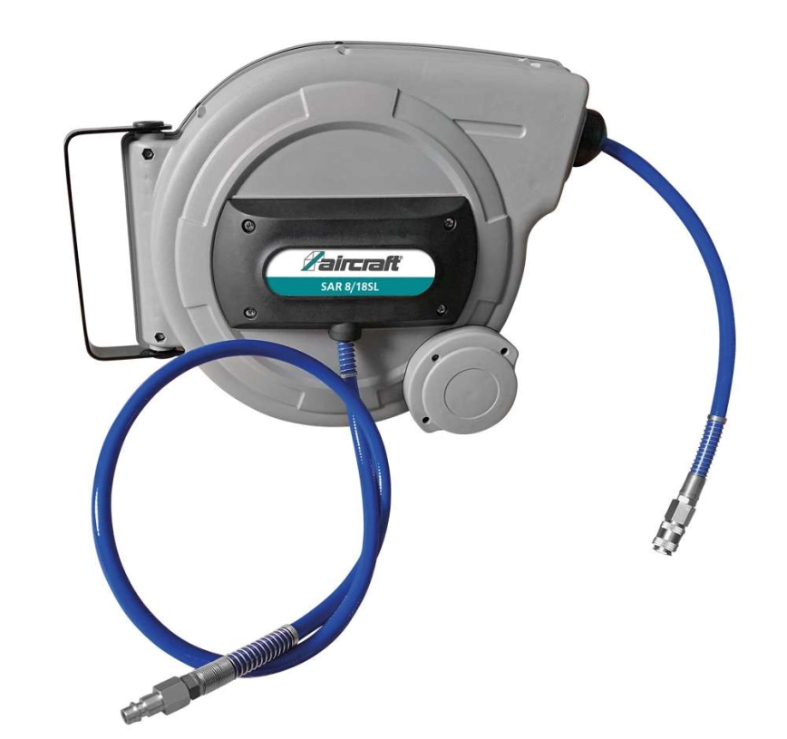Navíjecí buben s polyuretanovou hadicí v délce 18 m s rychlospojkou a vsuvkou DN 7,4 a s integrovanou brzdou regulující rychlost navíjení hadice zpět do bubnu. Pro montáž na stěnu nebo strop.