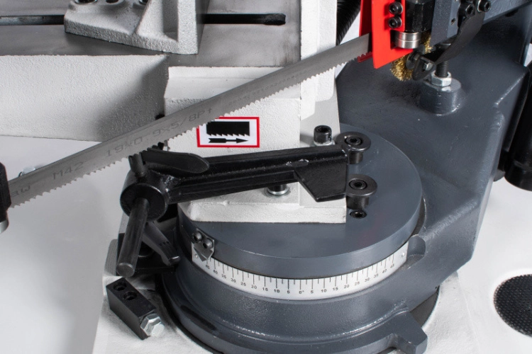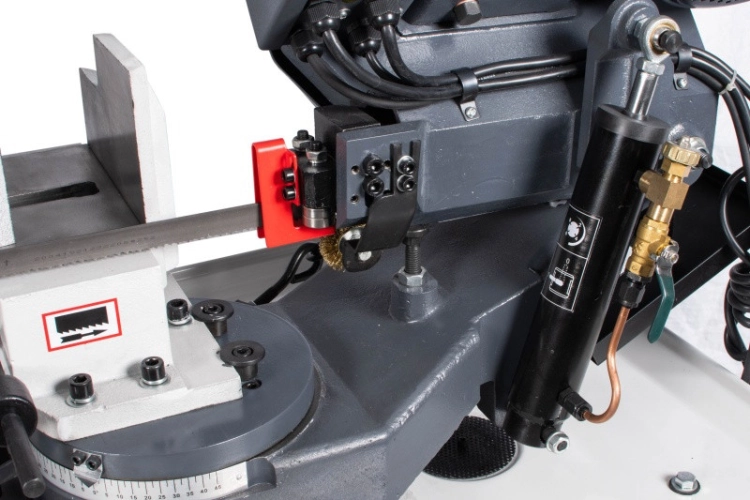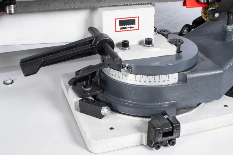 Řezání materiálu pod úhlem je zajištěno natáčením ramene pily.