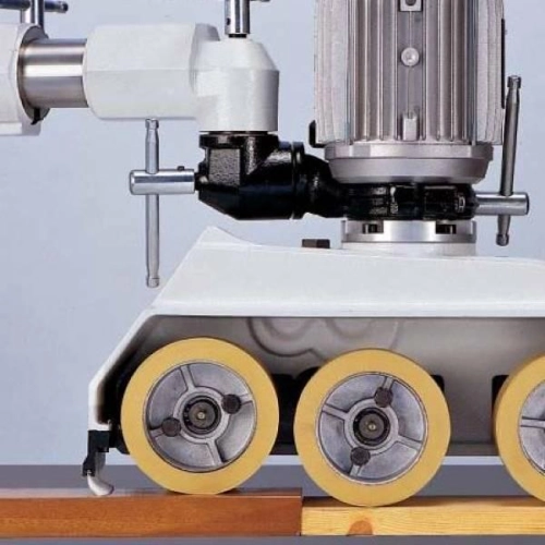 Čtyři fixní rychlosti, vpřed a vzad měníme takto: prvních dvou rychlostí docílíme záměnou ozubených kol uložených za krytem převodovky a další dvě rychlosti změníme otočením páčky vypínače na motoru s dvojitým vinutím (1400-2800 ot/min). Povrchová úprava přáškovou barvou je velmi odolná. Vyměnitelná ozubená kola jsou odlita, vytvrzena chemickou reakcí a zakalena. Podávací zařízení je vybaveno přestavitelným univerzálním stojanem, který umožňuje nastavení stroje do libovolné pozice.