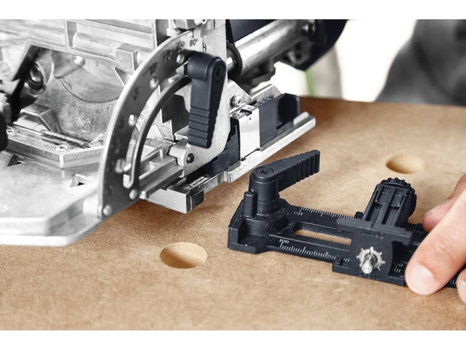 -Nárys není nutný ani u širokých obrobků, jako například boků skříní, protože s příčným dorazem lze osadit celou řadu kolíků s přednastavenou vzdáleností