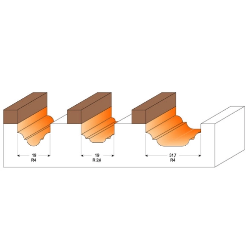 Široká nabídka profilových fréz CMT je určena pro výrobce skříněk a nábytku. Dodáváme 14 různých profilů na hrany stolů, obložení dveří nebo okrasné lišty. Každá profilová fréza může být upravena pro výrobu dvou profilů pouhou výměnou ložiska. Při výměně ložiska zkontrolujte, zda pravá strana černé podložky ložiska odpovídá otáčení ložiska. Nesprávná montáž může způsobit vypadnutí šroubu.