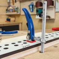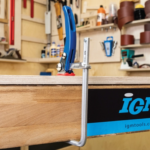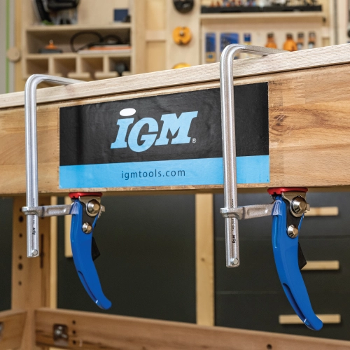 Tyto svěrky jsou díky svým rozměrům ideální pro uchycení šablon IGM k obráběnému materiálu. Jsou vhodné pro použití se šablonou FK650 pro spoj pracovních desek, díky úzkému ramenu nezabírá tolik místa jako klasické svěrky s velkou čelistí, a nepřekáží pak horní frézce při frézování spoje. Skvěle se hodí i pro použití se šablonou FKP900 pro vrtání policových podpěr nebo kolíkování, kde rychloupínací páková svěrka nepřekáží vrtačce nebo vrtacímu vřetenu. Spodní utahovací čelist je vybavena plastovou výměnnou krytkou, která zabezpečuje pevné uchycení bez poškození dílce.