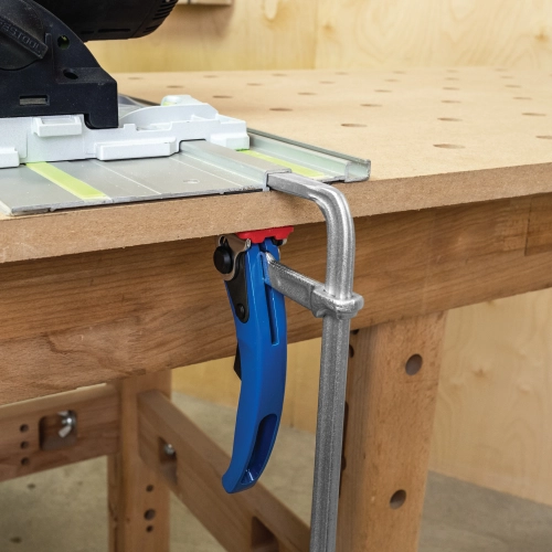 Tato páková svěrka má speciálně kované pevné rameno, které slouží pro bezpečné uchycení hliníkových vodících lišt značek Festool, Protool, Metabo, Makita a Hitachi. Je určena pro upínání v profilech, na pracovní stoly typu Festool MFT nebo pro vodicí lišty ponorných pil. Upínací rameno, které se zasouvá do lišty, má průřez 12 mm x 7,4 mm a je vhodné pro T drážky o rozměrech 12,7 x 8 mm.