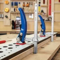 Rychloupínací svěrka je v dílně všestranným pomocníkem, využijete ji tedy například i jako doraz na pile, pokud jím není vaše pila vybavena. Stačí ji přichytit k profilu úhlovému pravítka a můžete tak snadno řezat velké množství stejně dlouhých kusů. Při přichycení k paralelnímu pravítku ji můžete využít jako hloubkový doraz, což se hodí např. při výrobě čepů.