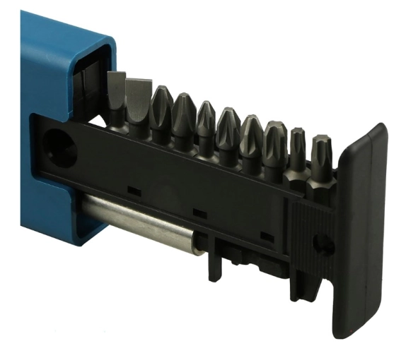 Sada bitů standard 10 ks. Sad obsahuje: bit plochý 0.6 x 4.5 mm – 1x, bit plochý 1.0 x 5 mm – 1x, bit PH2 – 2x, bit PZ1 – 1x, bit PZ2 – 2x, bit PZ3 – 1x, bit T15 – 1x, bit T25 – 1x, magnetický držák bitů – 1x