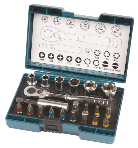 Sada bitů a nástrčných klíčů šestihran 1/4", 21 ks. Sada obsahuje ráčnu, držák bitů, bity 25 mm PH1, 2, 3, PZ1, 2, TX20, 25, 30, plochý 0.8 x 5.5, 1.2 x 6.5, imbus 4/6 a nástrčné klíče SW5, 6, 8, 10, 12, 13. Sada je dodávaná v plastové krabičce.