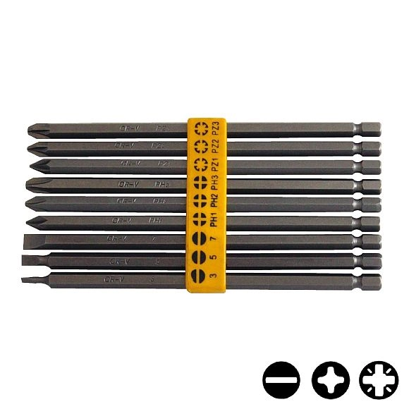 Ocelové 150 mm dlouhé bity z chrom-vanadiové oceli s dlouhou životností.