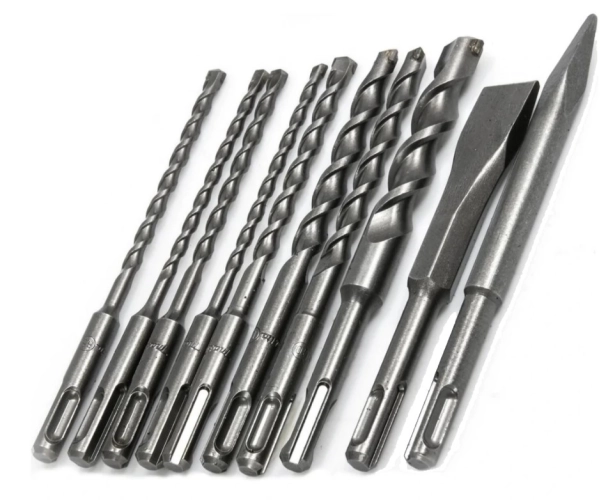 Sada obsahuje vrtáky 5 x 160, 5.5 x 160, 6 x 160, 6.5 x 160, 8 x 160, 10 x 160, 12 x 160, 16 x 160 mm, sekáč plochý 20 x 140 mm a sekáč špičatý 160 mm.