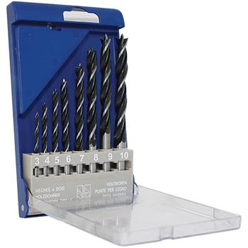 Sada vrtáků do dřeva 8 ks v rozměrech 3, 4, 5, 6, 7, 8, 9, 10 mm. Dodáváno v plastové krabičce.