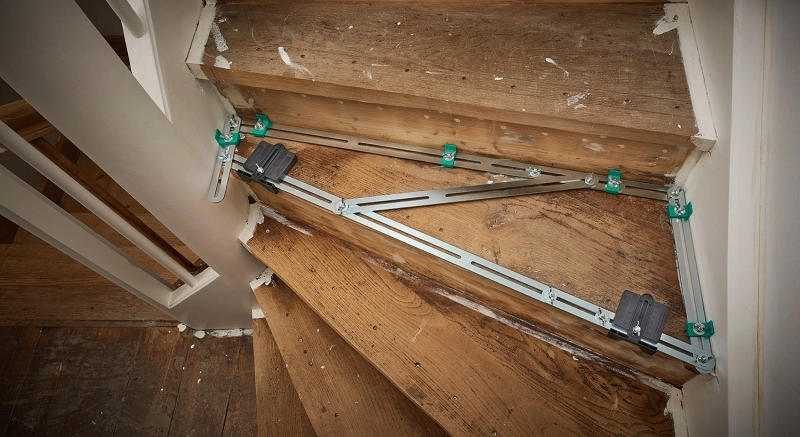 – fixuje tvar schodnice ve stabilní poloze, možnost snadného přenesení míry vhodné pro: dřevené schodiště pravidelných tvarů, schodnice nepravidelných tvarů, pokládka koberců a podlahovin na schodnicové stupně