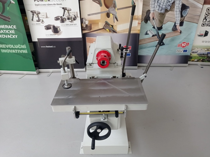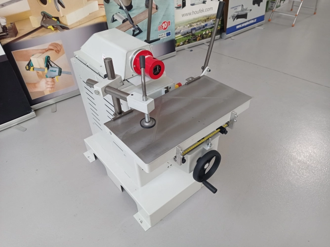 Výškové nastavení stolu: Pracovní stůl je výškově přestavitelný pomocí ovládacího kola, což umožňuje přizpůsobení různým velikostem obrobků.