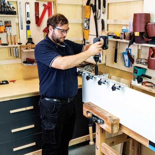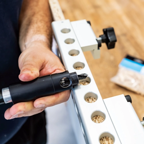 Kolíky i konfirmáty je možné vyrábět pouhou výměnou vrtáků ve vrtacím pouzdře.