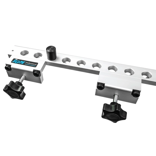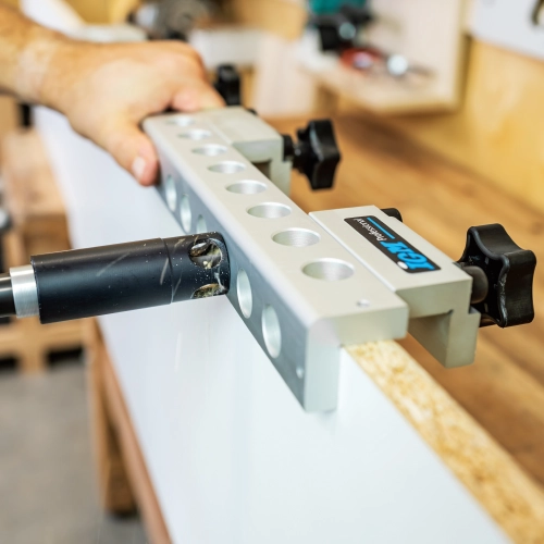 Do přípravku lze upnout materiál šířky od 18mm až do 38mm, což oceníte zvláště při práci s masivem. Středy otvorů jsou ve vzdálenosti 9mm od vnitřní hrany přípravku. Jedinečné vrtací vřeteno umožňuje použití různých průměrů kolíkovacích HM vrtáků od průměru 3mm do 12mm. Díky snadné změně průměru vrtáku můžete vrtat otvory nejen pro kolíky, ale pro konfirmáty, úchytky, NK panty, pro podpěry polic, pro vruty a euro šrouby.