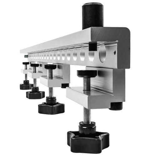 Univerzální vrtací přípravek je určen pro přesné a produktivní ruční kolíkování nábytkových dílců. Docílíte vysokou přesnost a produktivitu práce. Jednotlivé pozice děr jsou konstruovány s roztečí 32mm, což odpovídá standardní euro normě pro strojní kolíkování dílců. Přípravek je určen pro použití našich kolíkovacích vrtáků z HM tvrdokovovou špičkou, které jsou upnuté ve vrtacím pouzdru stejným systémem jako v kolíkovačce.
