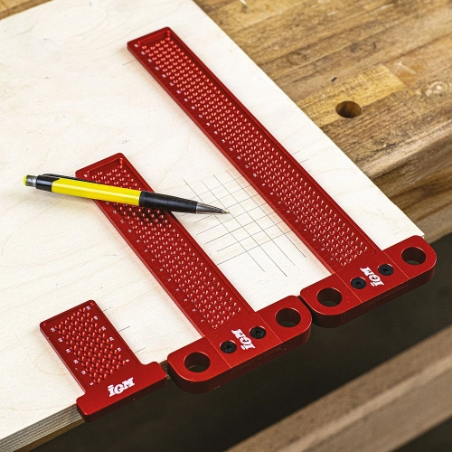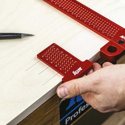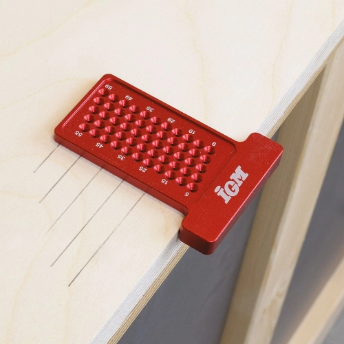 Malé kompaktní značící pravítko pro rýsování dokonale rovnoběžných čar podle hrany materiálu. Vložte tužku do odpovídajícího otvoru a vytvořte rovnoběžnou čáru posouváním pravítka po hraně dílce. Rovnoběžnou čáru můžete rýsovat ve vzdálenosti 5 až 60 mm od hrany dílce. Každý otvor představuje 1 mm.